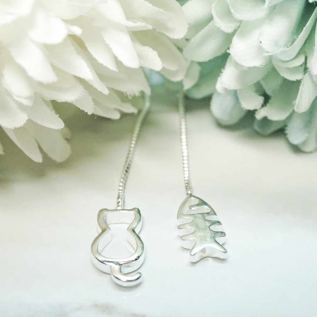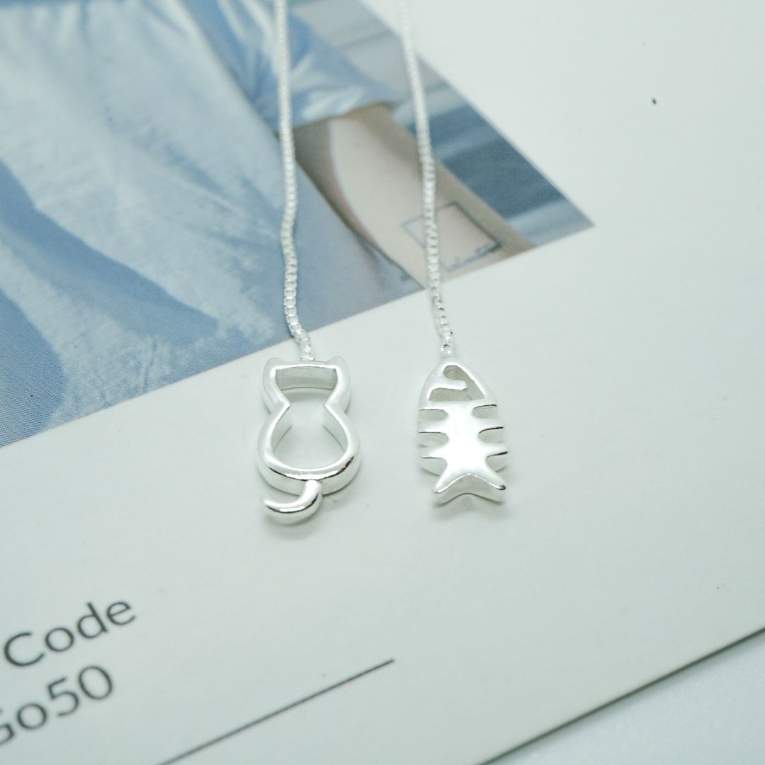 全純銀耳環|貓和魚 | 垂吊 | 拉線 | 耳環 | 設計款